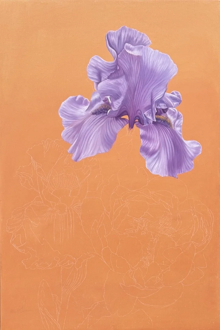 After toning the canvas, I began laying in the first iris. At this point, I focused only on the form of the petals, not value and hue. I used paint straight from the tube, thinned with refined linseed oil.