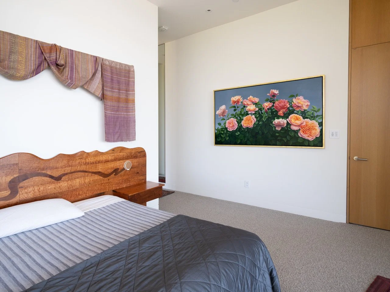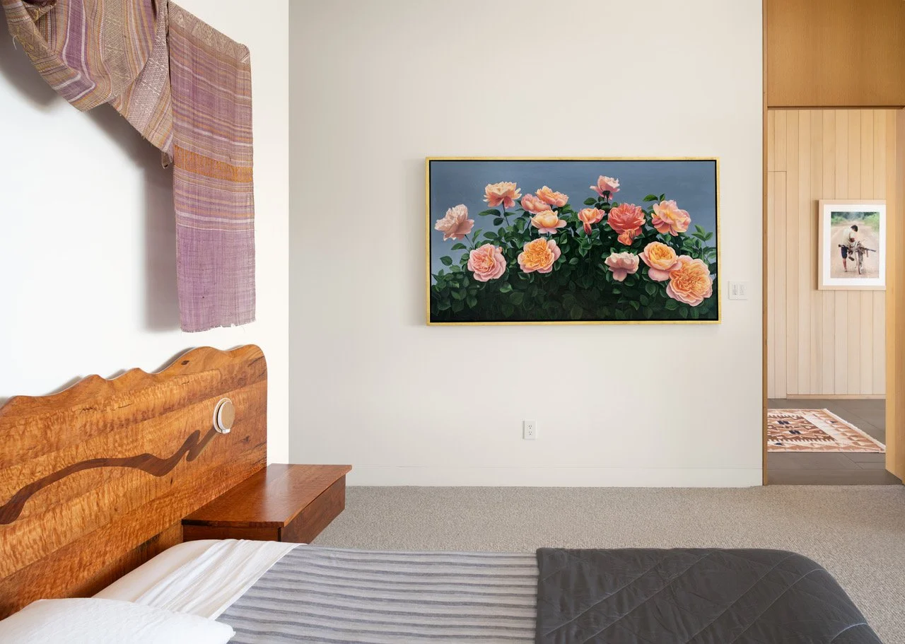 This painting transformed my work – and my life – forever. It was commissioned by a remarkable collector and patron of the arts who lost his home in the 2017 Wine Country Fires. The fire destroyed everything on the property except the grapevines and one rose bush. But then something miraculous happened. In the spring, that single rose bush began to bloom gloriously. The homeowner decided to build a new house on the same site and asked me to create a 6-foot painting of that rose bush for the home. We titled the painting “The Phoenix Rose” because it literally rose out of the ashes and is a powerful symbol of hope, resilience and reemergence
